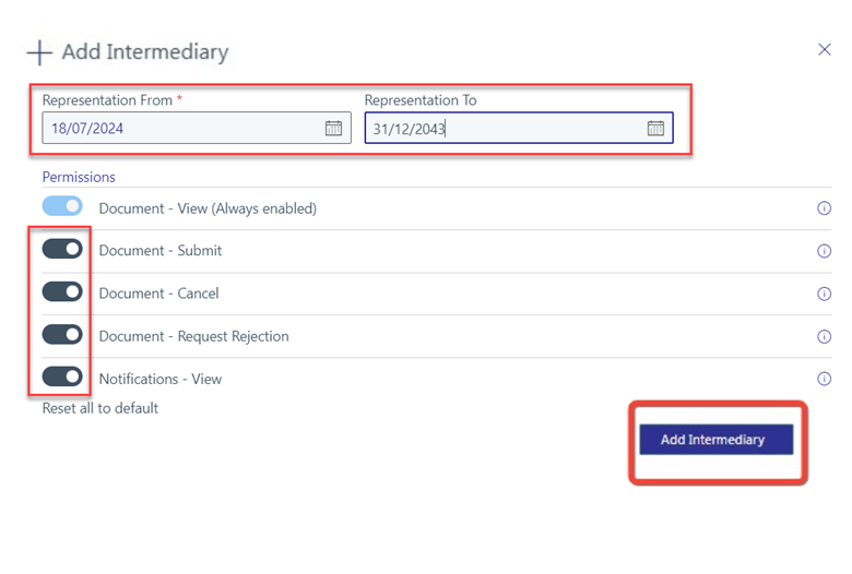 Set the ‘Representation From’ and ‘Representation To’ dates, customize the permissions as required, then click ‘Add Intermediary’ to complete the process.