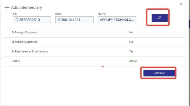 Click the search icon to verify the TIN, BRN and Name. Once validated, click ‘Continue’ to move forward.